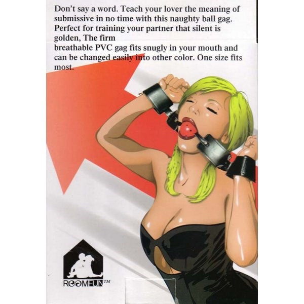 Breathable ball gag with integrated wrist restraints. 1.75-inch PVC ball with air holes for extended bondage scenes. Leather straps with Velcro closures.