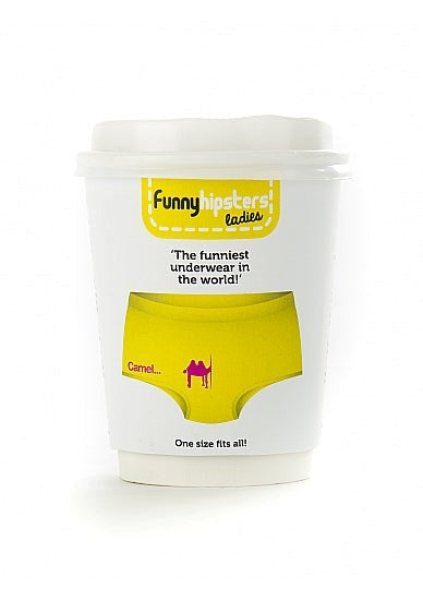 100% cotton hipster underwear with humorous camel graphic design. One-size-fits-most stretch fit for all-day comfort and laughs.