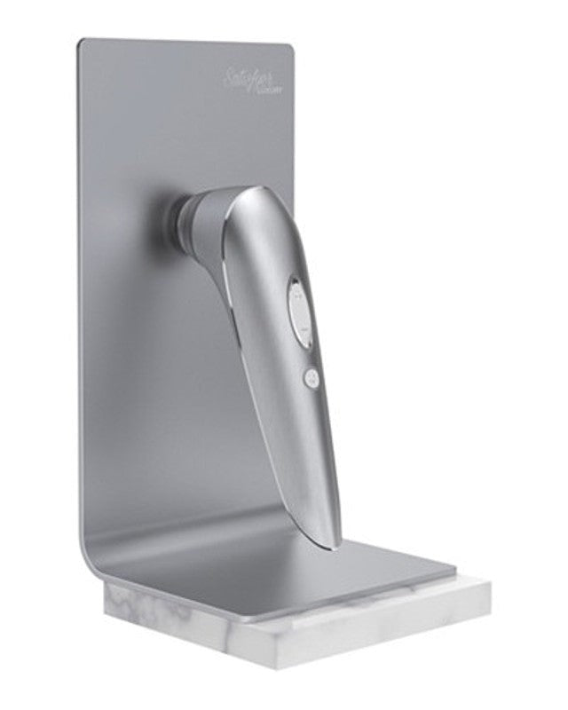 Dual-motor clitoral massager with 11 pressure wave intensities and 10 vibration patterns. Brushed aluminum and medical-grade silicone construction.