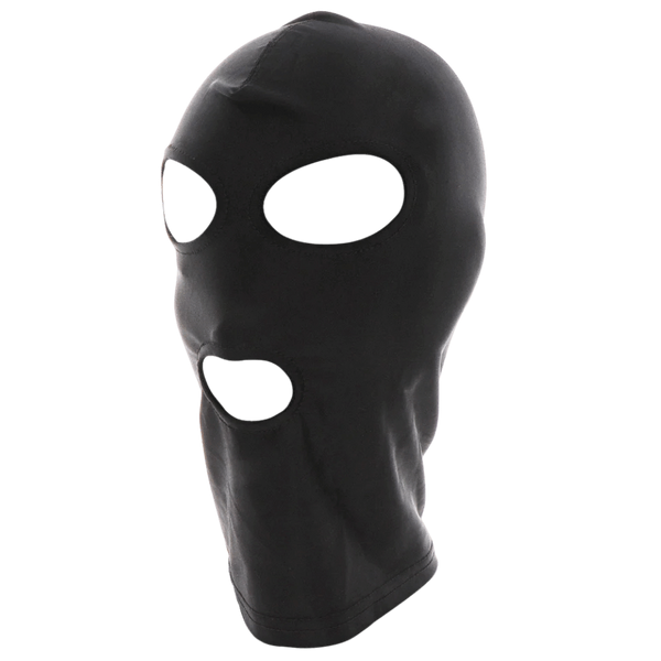 Stretchy spandex hood with eye and mouth openings for sensory play. Lightweight design for comfortable restraint and anonymity.