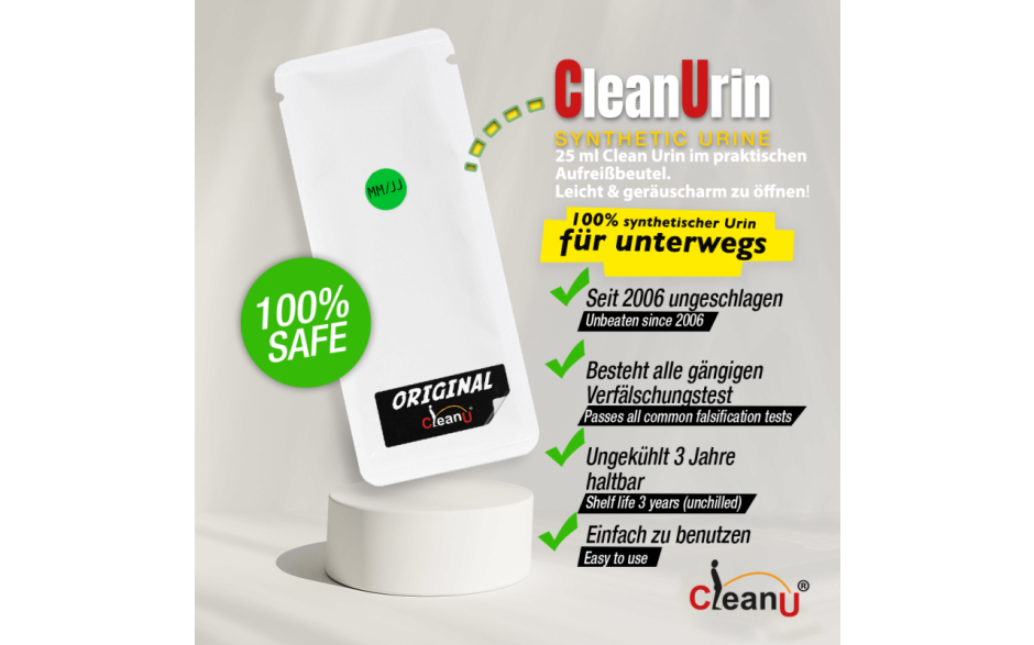 Synthetic urine sachet with dual-tear design for discreet use. Body-temperature stable formula maintains natural characteristics without external heating.