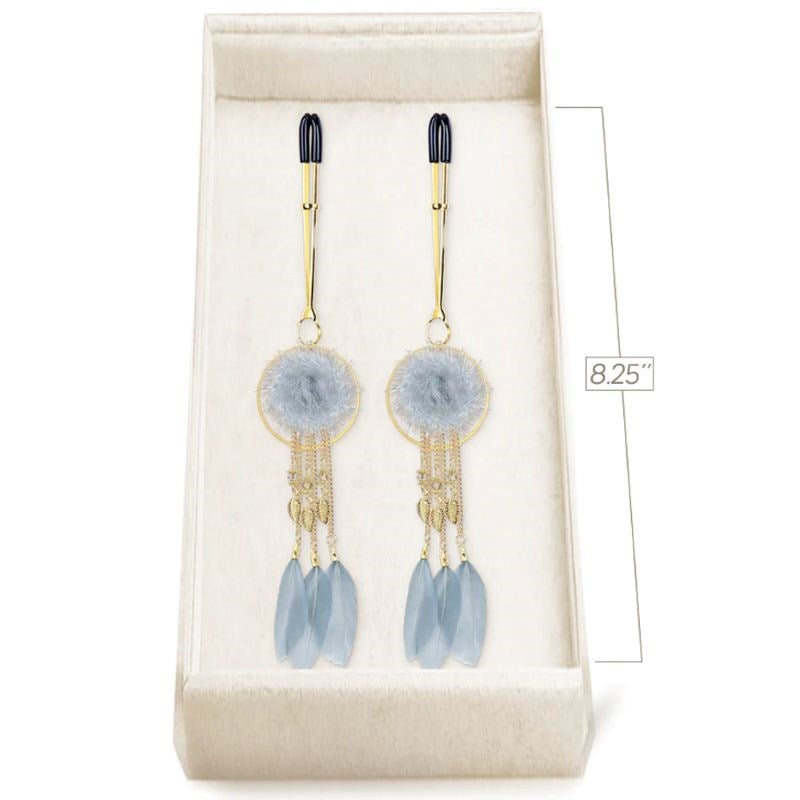 Adjustable nipple clamps with soft feathers and gold accents. Stainless steel construction with customizable tension for layered sensation play.