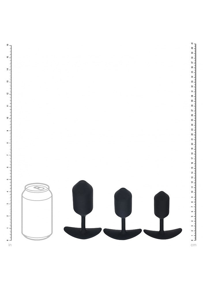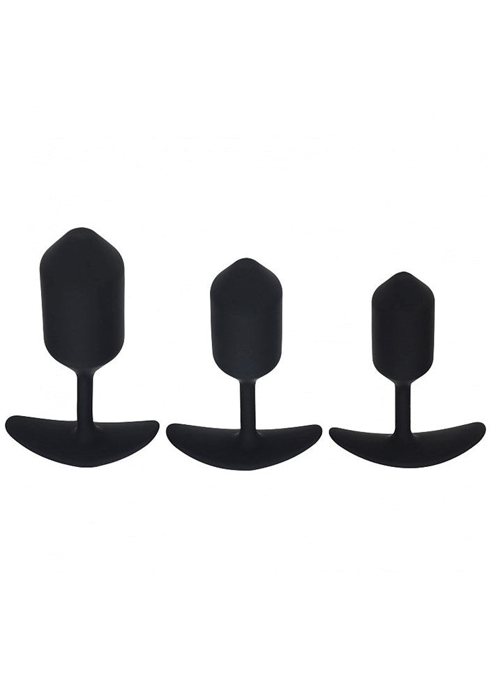 Three graduated silicone anal plugs with metal cores for progressive training. Tapered tips and flexible necks for smooth insertion and comfortable wear.