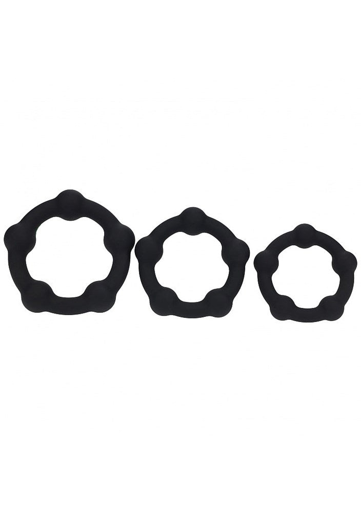 Three-ring silicone cock ring set with beaded texture. Extra small, small, and medium sizes for customisable fit and stacking options.
