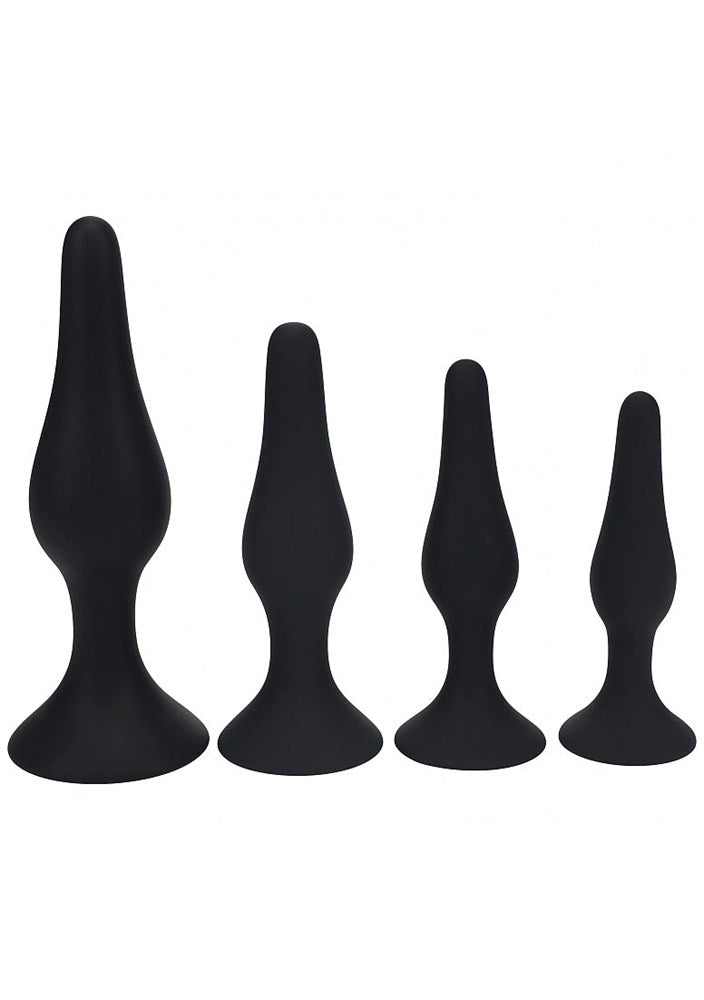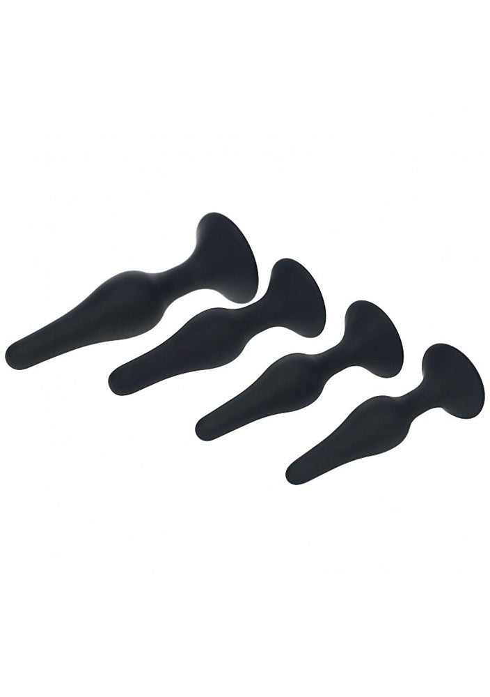 Four graduated silicone anal plugs with tapered design and flared bases. Progressive kit for comfortable exploration and training.