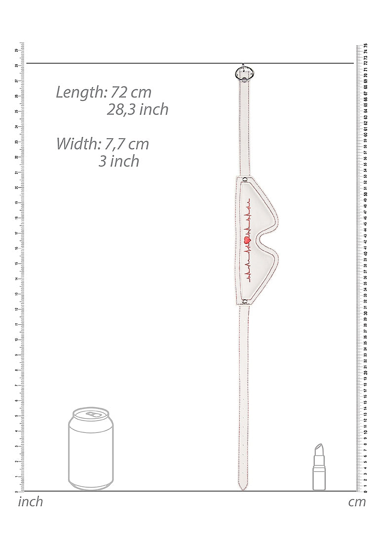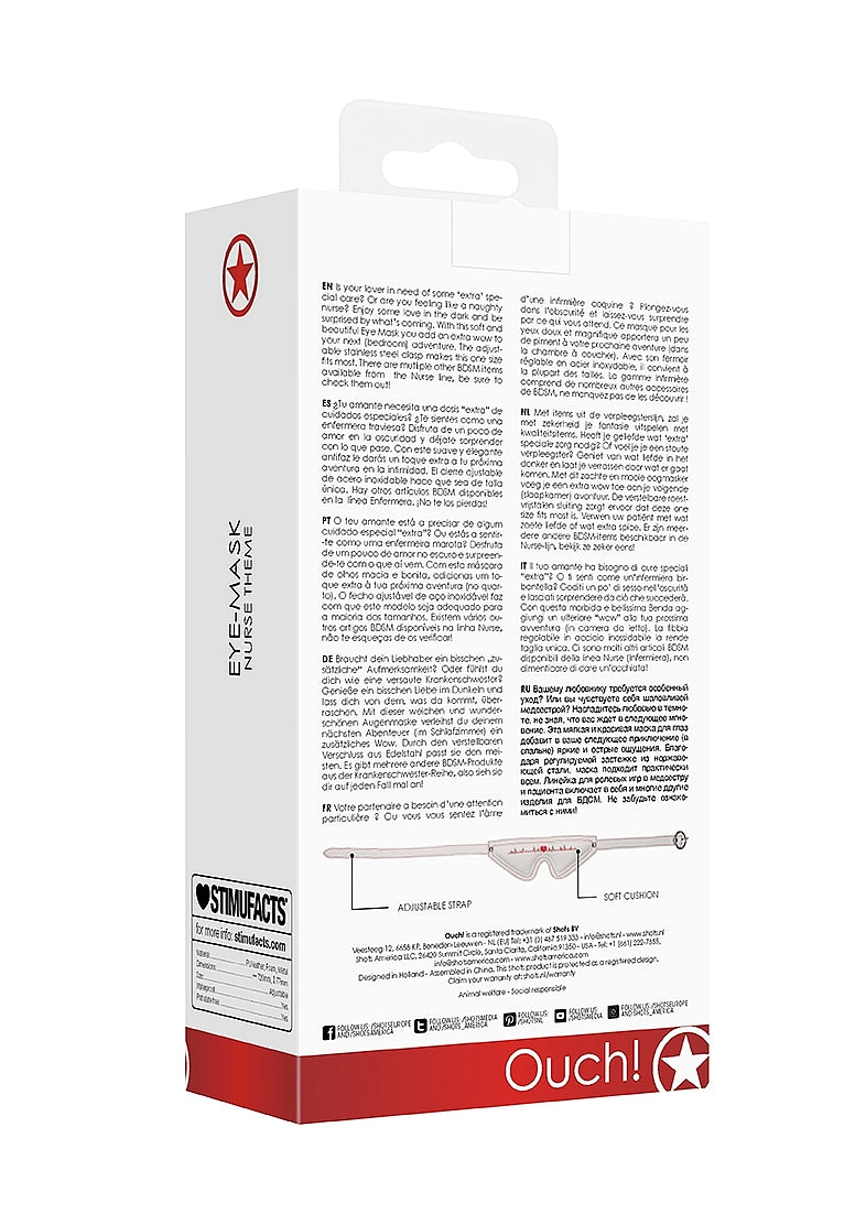 Nurse-themed BDSM eye mask with adjustable steel clasp. Soft PU construction blocks light for sensory deprivation play and roleplay scenarios.