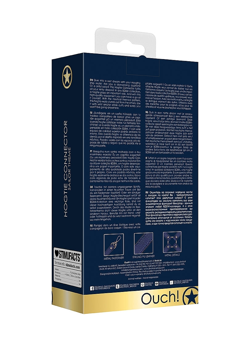 Sailor-themed hogtie connector with four-point restraint system. PU straps and zinc alloy hardware link wrists and ankles for complete immobilization.