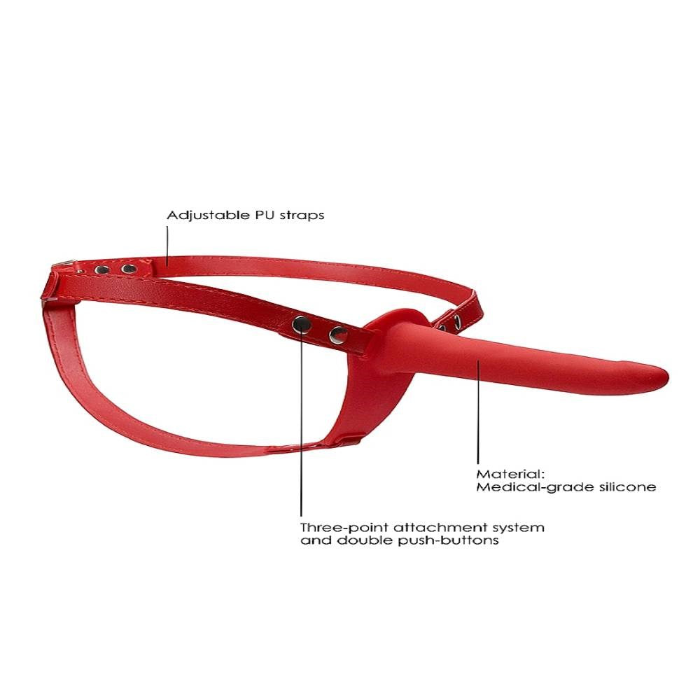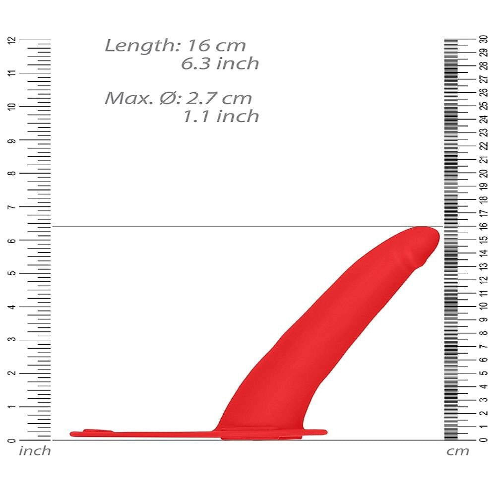 Medical-grade silicone strap-on dildo with adjustable three-point harness. 16 cm insertable length, double push-button security for couples.