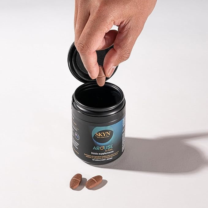 Boost male libido with SKYN Arouse For Him. Natural supplement blend with Horny Goat Weed, Tribulus Terrestris, and Ginseng. 60 tablets.