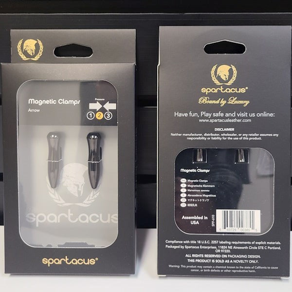 Magnetic nipple or clit clamps with arrow-shaped design for targeted stimulation. Adjustable pressure and stainless steel construction for temperature play.