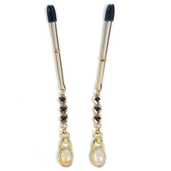 Adjustable tweezer-style nipple clamps with pearl pendant. Golden metal jaws deliver customizable pressure for sensory play.