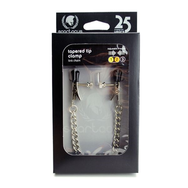 Adjustable metal nipple clamps with tapered broad tips and 6-inch connecting chain. Customizable pressure control for extended play sessions.