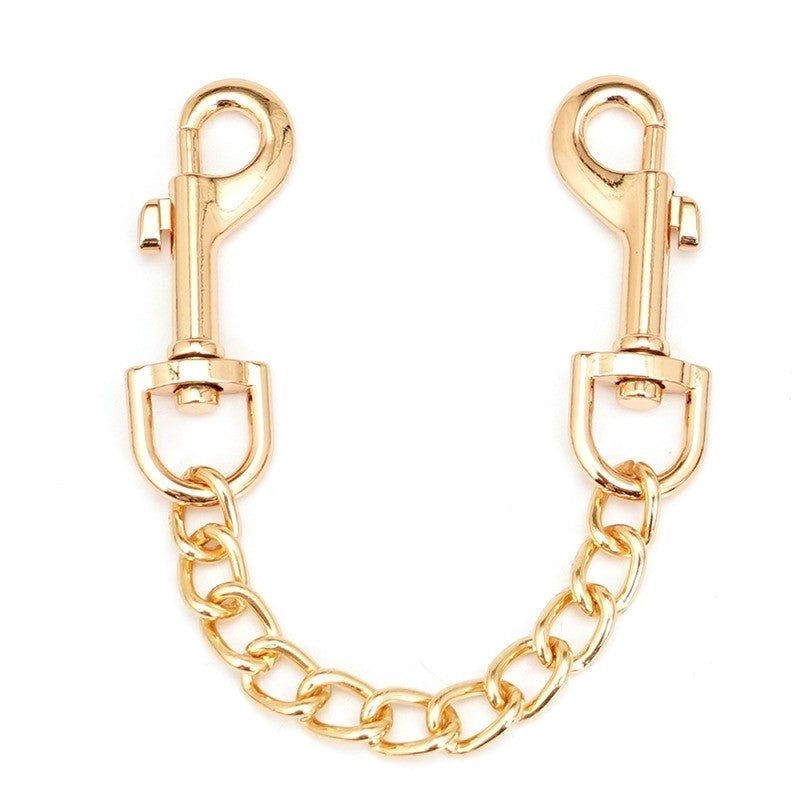 Lambskin leather wrist restraints with white snake print design. Padded cuffs with adjustable buckles and removable chain for bondage play.