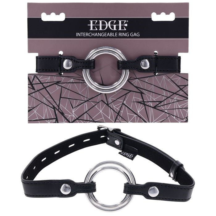 Interchangeable ring gag with dual stainless steel rings (3.5cm and 5.1cm). Adjustable buckle system with swappable bite pieces for progressive BDSM play.