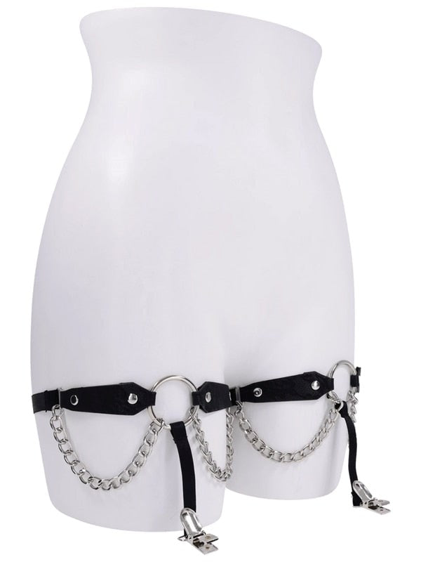 Lace-etched faux leather thigh garters with draped chains. Adjustable fit for 16-24 inch thighs with secure clips for stockings.