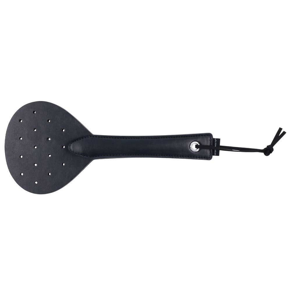 PU leather spanking paddle with perforated design and split-tipped edge. 29.2 cm paddle delivers crisp strikes with reduced air resistance for BDSM couples.