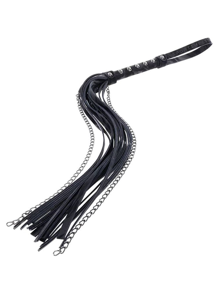 Dual-material impact flogger combining soft leather falls with hematite chains. 17-inch reach for versatile BDSM play and sensation variety.