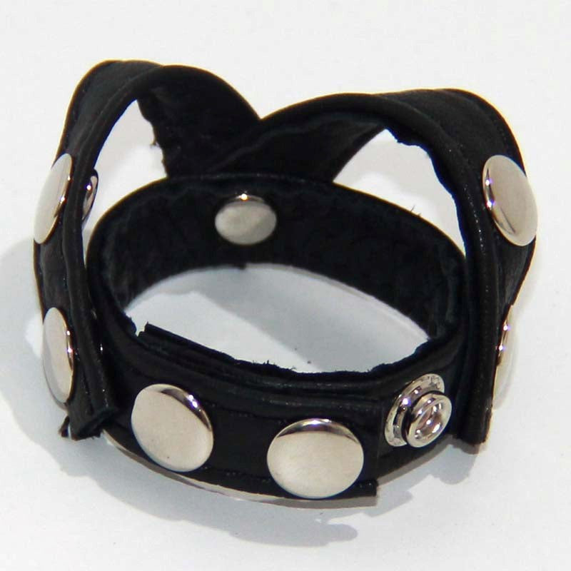 Genuine leather testicle and cock harness with fully adjustable straps and metal snap closures for customizable support and sensation.