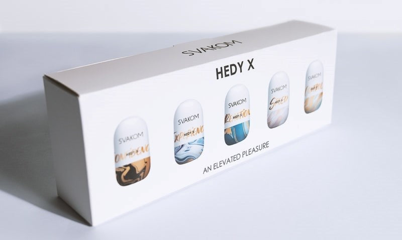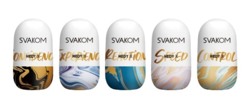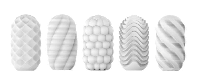 Five reversible TPE masturbator sleeves delivering ten distinct textures. Each sleeve warms to body temperature with included water-based lubricant sachets.