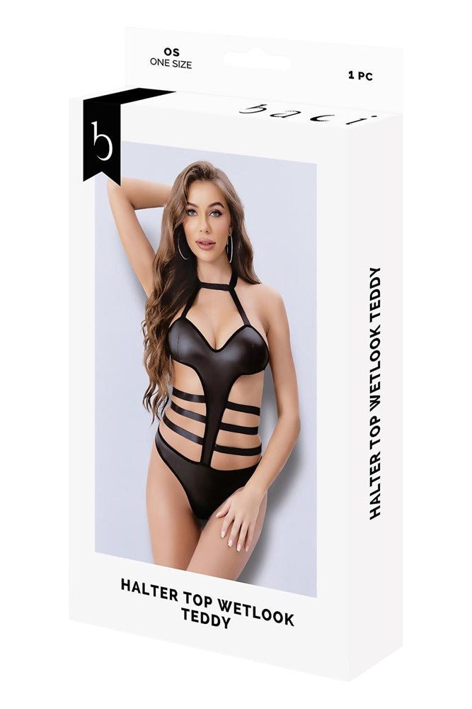 Wetlook teddy with halter straps and daring side cutouts. One-size polyester lingerie with partial open back for seductive occasions.