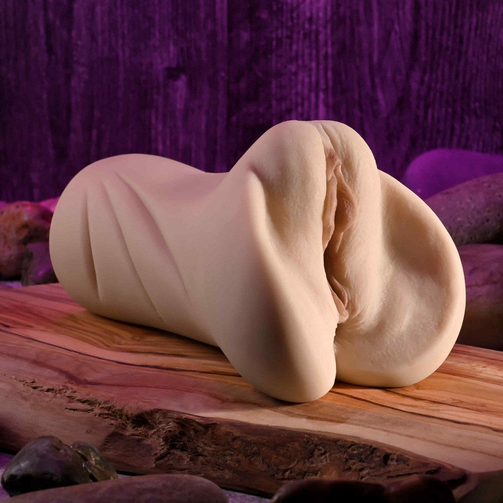 TPR dual-entry stroker with textured beaded channels and realistic proportions. Includes feature-length film download for immersive stimulation.