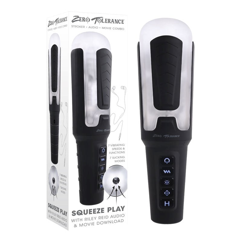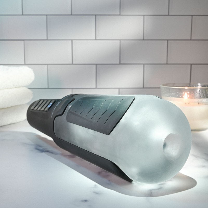 Dual-action male masturbator with vibration and suction. Squeeze control grips let you adjust pressure on demand with 49 mode combinations.