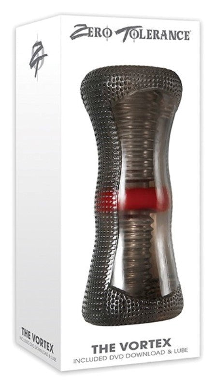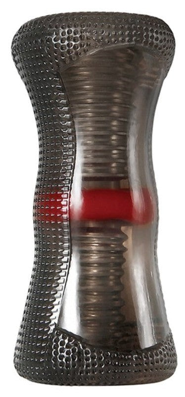 Dual-channel male stroker with progressive tightening sensation. Temperature-responsive TPE with central grip ring for multi-stage stimulation.